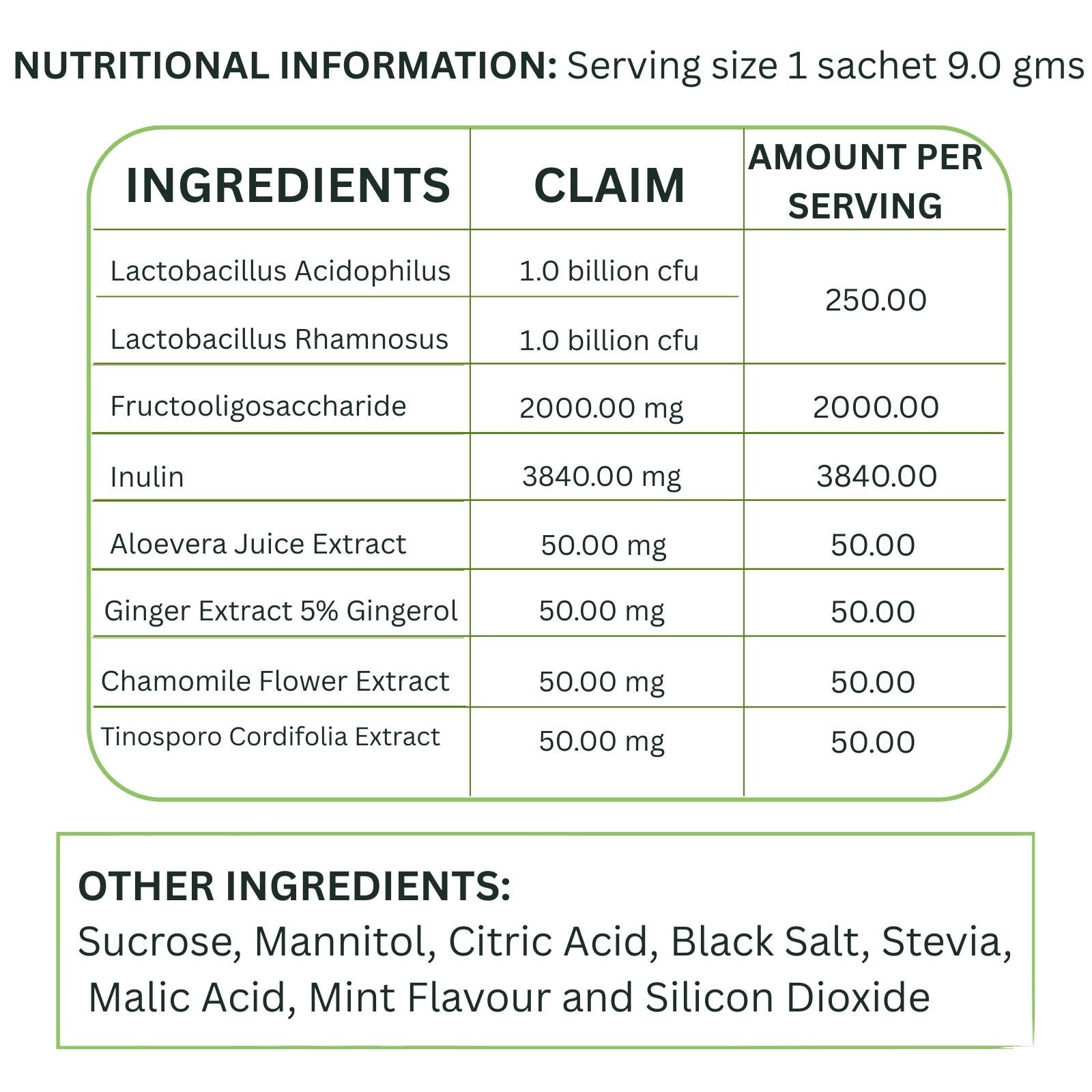 · Herbal extracts (Chamomile, Aloe Vera, Ginger, Giloy) for digestive comfort, stress reduction, and immune support.